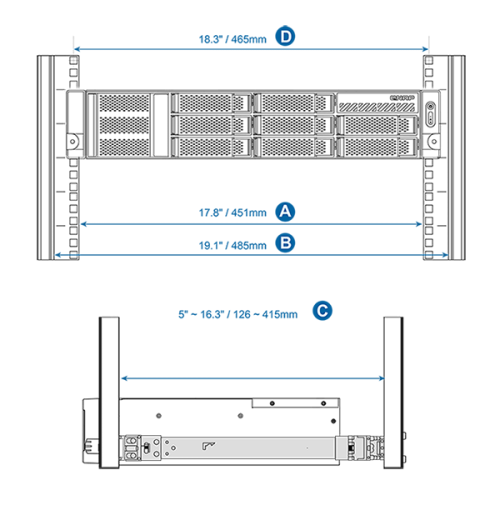 Kompatibilní se serverovými stojany se čtvercovými otvory 9,5 mm x 9,5 mm nebo s kulatými otvory o průměru 7,1 mm.