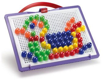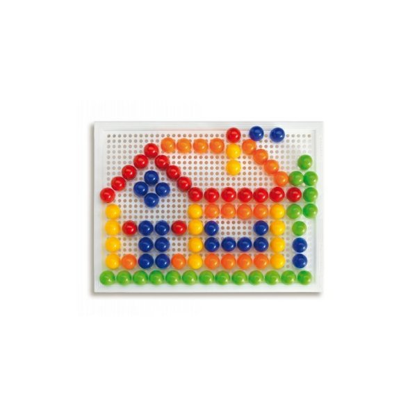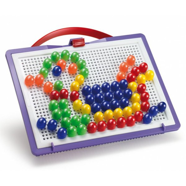 Mozaiky u dětí rozvíjejí jemnou motoriku, tvořivost a fantazii. Skládají se z kufříku, perforované hrací desky a barevných kolíčků s hlavičkami různých barev, průměrů a tvarů. Pomocí těchto kolíčků, které se zasazují do otvorů v hrací desce, tvoří děti různé obrázky nebo vzory. Po skončení hry lze vše uložit do kufříku, jehož víko po zajištění pojistkou tvoří sama hrací deska. Vyrobeno z plastů špičkové kvality. Hlavní vlastnosti: rozvíjí jemnou motoriku, tvořivost a fantaziiobsahuje 100 knoflíků o průměru 15 mm