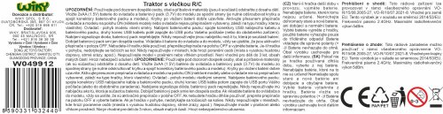 Traktor RC na dálkové ovládání. Velikost 24 cm. Frekvence 2.4GHz. Bateriový pack 3.7V do traktoru součástí, 2xAA do ovladače nejsou součástí. USB kabel součástí. Přepínač ON/OFF na spodní straně traktoru.