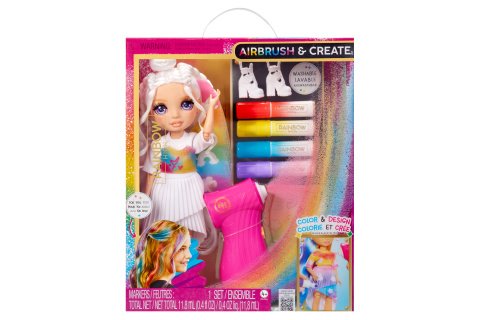 Posláním Rainbow High je vštípit důvěru v barevnou kreativitu. Nyní můžete vdechnout život své vizi s panenkou Airbrush & Create. Navrhněte si vlastní panenku Rainbow High jednoduše. Sada obsahuje 1 airbrush stlačený vzduch, omyvatelné duhové fixy a 1 módní panenku s kompletním oblečením. Módní panenka od Air Brush & Create je jako prázdné plátno. Je oblečená celá v bílé a má bílé vlasy. Čtyři omyvatelné fixy v červené, žluté, modré a fialové barvě. Jednoduše vložte duhovou omyvatelnou fixu, nastříkejte a sledujte, jak se děje kouzlo. Vybarvěte si vlasy, oblečení a dokonce i boty. Chcete větší přesnost? Použijte fixu přímo na oblečení pro detailní kresby. Omyvatelné fixy usnadňují mytí vlasů a oblečení. Kreslete znovu a znovu. Když skončíte s tvořením, můžete si s panenkou hrát donekonečna. Věk 3+
