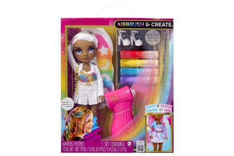 Posláním Rainbow High je vštípit důvěru v barevnou kreativitu. Nyní můžete vdechnout život své vizi s panenkou Airbrush & Create. Navrhněte si vlastní panenku Rainbow High jednoduše. Sada obsahuje 1 airbrush stlačený vzduch, omyvatelné duhové fixy a 1 módní panenku s kompletním oblečením. Módní panenka od Air Brush & Create je jako prázdné plátno. Je oblečená celá v bílé a má bílé vlasy. Čtyři omyvatelné fixy v červené, žluté, modré a fialové barvě. Jednoduše vložte duhovou omyvatelnou fixu, nastříkejte a sledujte, jak se děje kouzlo. Vybarvěte si vlasy, oblečení a dokonce i boty. Chcete větší přesnost? Použijte fixu přímo na oblečení pro detailní kresby. Omyvatelné fixy usnadňují mytí vlasů a oblečení. Kreslete znovu a znovu. Když skončíte s tvořením, můžete si s panenkou hrát donekonečna. Věk 3+