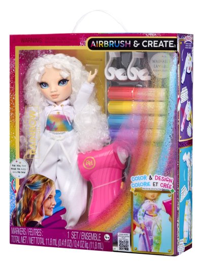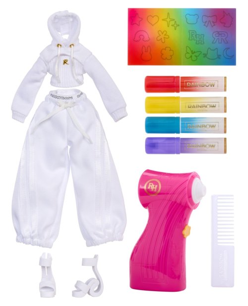 Cílem Rainbow High je podporovat kreativitu a sebevědomí prostřednictvím barev. Představujeme nový způsob, jak barevně stylovat panenku, kterou můžeš upravit podle své fantazie. Panenka je celá bílá, od hlavy až k patě, což ti umožní snadno vytvářet barevné variace a měnit její outfit nebo účes znovu a znovu. Můžeš použít omyvatelné fixy z balení v Airbrush pistoli nebo kreslit přímo na oblečení a vlasy. Poté stačí opláchnout a opakovat. Znovu a znovu.