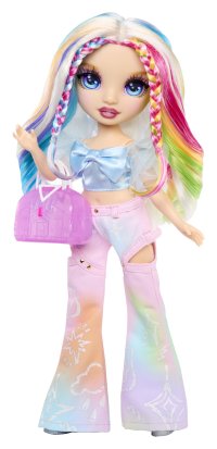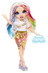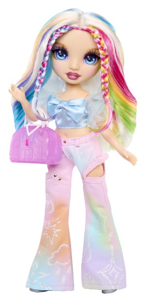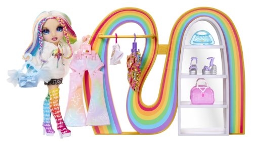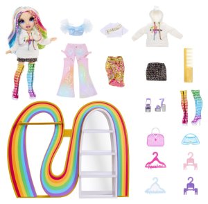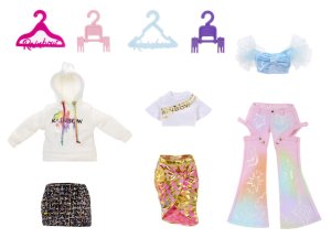 Obsah balení: • 1 panenka • Šatník s duhovou stěnou • 6 módních kousků • 2 páry bot • 2 kabelky • 1 hřeben • Šatní stojan se 4 ramínky • 4 patrové regály na boty