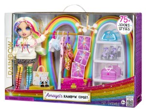Zapoj svou fantazii s novým Amayiným Duhovým Šatníkem. Tento herní set obsahuje Fashion panenku s duhovými vlasy a botami. V balení najdeš stylové oblečení na ramínku, kabelky a boty, se kterými vytvoříš více než 75 looků. Vyber ten nejlepší outfit pro svou panenku!