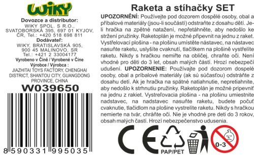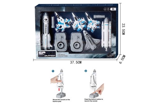 Raketa s odpalovací plošinou 17,5 cm set. Obsah balení - 2x odpalovací plošina, 2x nástavec na odpalovací plošinu, raketa na raketoplán 14 cm, raketa 17,5 cm, raketoplán na zpětné natažení 10 cm, 3x stíhačka na zpětné natažení 9 cm. Raketoplán je možné připevnit na jednu z raket. Vystřelovací plošina - na plošinu umístěte nástavec, na nástavec nasuňte raketu, uslyšíte cvaknutí, tlačítkem na plošině vystřelíte raketu.