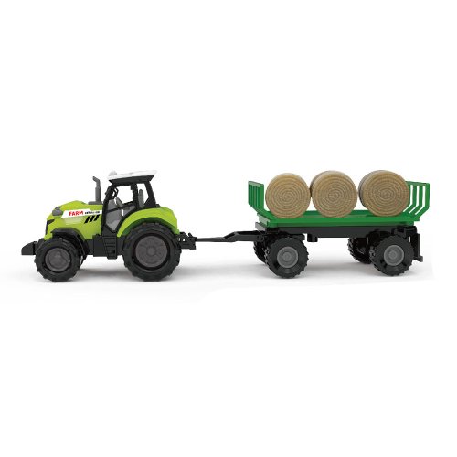 Moderní plastový farmářský traktor s vlečkou a balíky slámy, hračka z kolekce Moje malá farma. Vlečka se dá jednoduše odpojit a balíky sundat. Traktor jezdí na volný chod a jeho délka je 10 cm. Přívěs je v délce 12 cm, celková délka včetně přívěsu je 25 cm. Zmáčknutím tlačítka na traktoru vydává reálné zvuky spolu se světelným efektem. Traktor vyžaduje 3 ks baterií typu AG13/LR44, které jsou součástí balení.