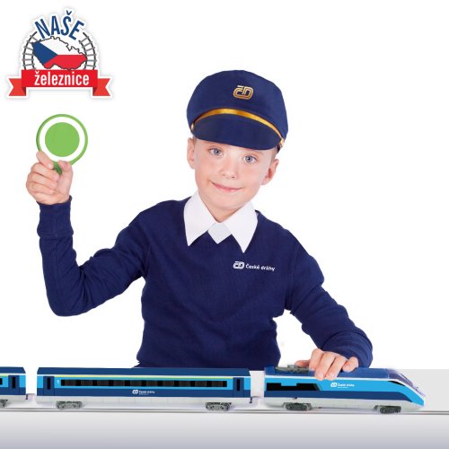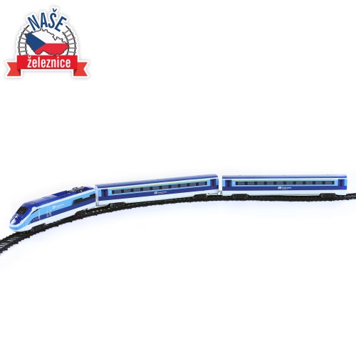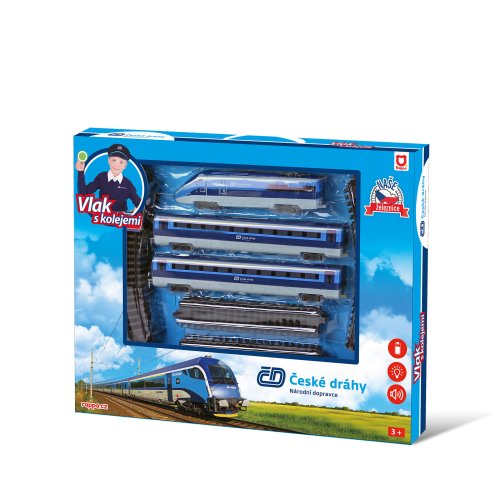 Sada s originálním vlakem od Českých drah obsahuje lokomotivu se dvěma vagóny i vláčkodráhu skládající se z 12ti zahnutých a 8mi rovných kolejí. Vlak vydává zvuk a svítí. Vhodné od 3 let.