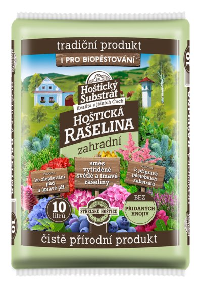 Hoštická rašelina zahradní je směs vytříděné světlé a tmavé rašeliny. Má všestranné využití v zahradnictví, lesnictví i v zemědělství. Je vhodná ke zlepšování zahradních půd, k jejich provzdušňování, vylehčování a úpravě pH. Umožňuje dobrý růst a bohatou tvorbu kořenů. V půdě zadržuje vláhu a chrání rostliny před vysycháním. Tím, že obohacuje půdu o organické látky, zlepšuje zadržování živin pro rostliny a zamezuje jejich vyplavování do spodních vod. Jedná se o čistě přírodní produkt, nemá upravené pH a nemá přidané živiny. Balení: 10 l.