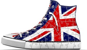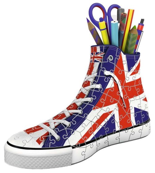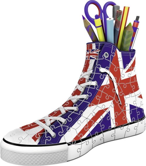 Geniální spojení pro milovníky tenisek a skládání! Poskládejte si 3D puzzle neotřelého tvaru, které oživí Váš stůl... RAVENSBURGER se pustil do produkce 3D tenisek, které lze použít třeba jako originální tužkovníky pro pera, pastelky nebo třeba štětce. Speciální zakřivené nebo ohebné dílky, které přesně zapadnou na své místo, umožňují postavit designovou tenisku s potiskem anglické vlajky, která působí velmi reálně. Dílky jsou vyrobeny z pevného plastu a zaručí vynikající stabilitu. Kecka drží bez nutnosti lepení. Balení obsahuje: 108 očíslovaných dílků puzzle, 4 díly příslušenství a návod. Upozornění: Obsah tenisky vyobrazený na fotografii není součástí balení. Ilustrační video Rozměr složeného puzzle cca 8,7 x 21,4 x 13,4 cm