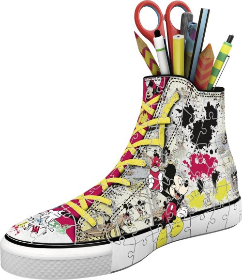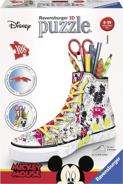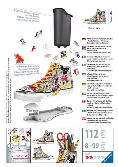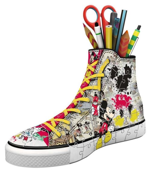 Geniální spojení pro milovníky tenisek a skládání! Poskládejte si 3D puzzle neotřelého tvaru, které oživí Váš stůl ... RAVENSBURGER se pustil do produkce 3D tenisek, které lze použít třeba jako originální tužkovníky pro pera, pastelky nebo třeba štětce. Speciální zakřivené nebo ohebné dílky, které přesně zapadnou na své místo, umožňují postavit designovou tenisku. Dílky jsou vyrobeny z pevného plastu a zaručí vynikající stabilitu. Kecka drží bez nutnosti lepení. Balení obsahuje: 108 očíslovaných dílků puzzle, 4 díly příslušenství a návod. Upozornění: Obsah tenisky vyobrazený na fotografii není součástí balení. Rozměr složeného puzzle cca 21,4 x 13,5 cm