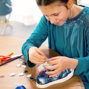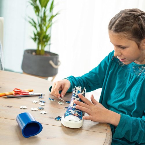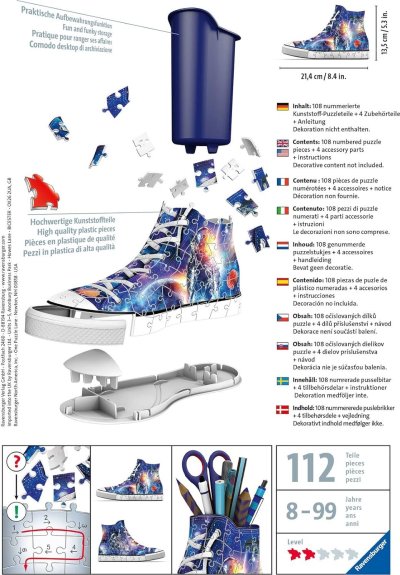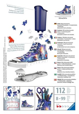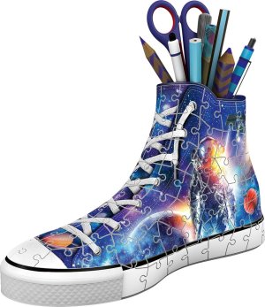 Geniální spojení pro milovníky tenisek a skládání! Poskládejte si 3D puzzle neotřelého tvaru, které oživí Váš stůl ... RAVENSBURGER se pustil do produkce 3D tenisek, které lze použít třeba jako originální tužkovníky pro pera, pastelky nebo třeba štětce. Speciální zakřivené nebo ohebné dílky, které přesně zapadnou na své místo, umožňují postavit designovou tenisku s vesmírným potiskem. Dílky jsou vyrobeny z pevného plastu a zaručí vynikající stabilitu. Kecka drží bez nutnosti lepení. Balení obsahuje: 108 očíslovaných dílků puzzle, 4 díly příslušenství a návod.. Upozornění: Obsah tenisky vyobrazený na fotografii není součástí balení. Rozměr složeného puzzle cca 21,4 x 13,5 cm