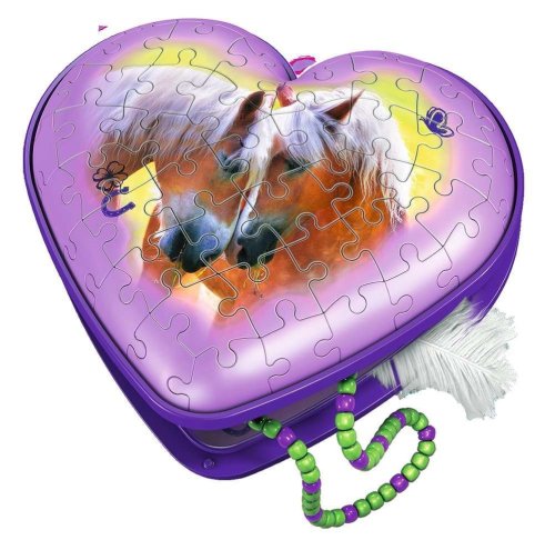Uzavíratelná dekorativní šperkovnice ve tvaru srdíčka s motivem koní se stane skvělým dárkem pro každou příležitost. Speciální zakřivené nebo ohebné dílky, které přesně zapadnou na své místo, umožňují postavit designovou šperkovnici, která působí velmi reálně. Dílky jsou vyrobeny z pevného plastu a zaručí vynikající stabilitu. Srdce drží bez nutnosti lepení. Balení obsahuje : 54 očíslovaných dílků puzzle, 6 dílů příslušenství a návod. Obsah krabičky vyobrazený na fotografii není součástí balení. Rozměr složeného puzzle cca 10,3 x 11,2 cm