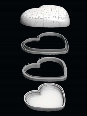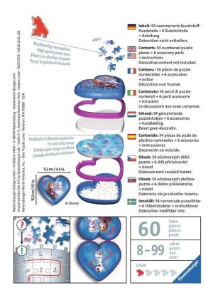 Uzavíratelná dekorativní šperkovnice ve tvaru srdíčka s obrázky Anny a Elsy z Ledového království. Speciální zakřivené nebo ohebné dílky, které přesně zapadnou na své místo, umožňují postavit designovou šperkovnici, která působí velmi reálně. Dílky jsou vyrobeny z pevného plastu a zaručí vynikající stabilitu. Srdce drží bez nutnosti lepení. Balení obsahuje: 54 očíslovaných dílků, 6 ks příslušenství a návod. Obsah krabičky vyobrazený na fotografii není součástí balení. Rozměr složeného puzzle cca 11,2 x 10,3 cm