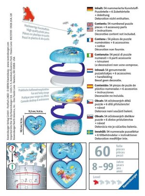 Uzavíratelná dekorativní šperkovnice ve tvaru srdíčka s motivem podmořského života se stane skvělým dárkem pro každou příležitost. Speciální zakřivené nebo ohebné dílky, které přesně zapadnou na své místo, umožňují postavit designovou šperkovnici, která působí velmi reálně. Dílky jsou vyrobeny z pevného plastu a zaručí vynikající stabilitu. Srdce drží bez nutnosti lepení. Balení obsahuje: 54 očíslovaných dílků puzzle, 6 dílů příslušenství a návod. Obsah krabičky vyobrazený na fotografii není součástí balení. Rozměr složeného puzzle cca 11,2 x 10,3 cm
