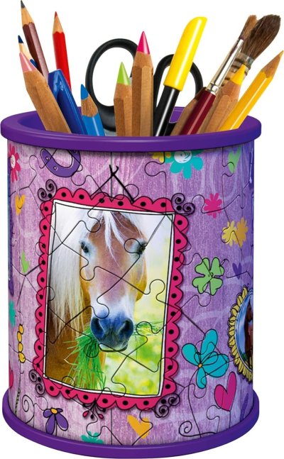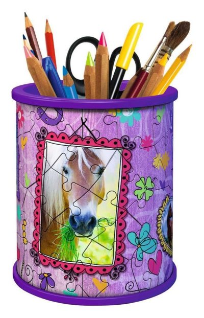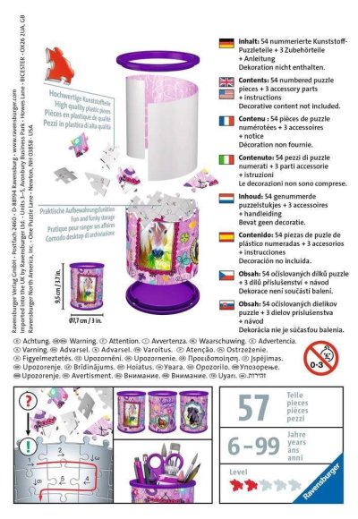 Tužky už se nebudou válet po stole a navíc bude krásný dárek vždycky na očích! Další z řady praktických předmětů ve formě 3D puzzle od výrobce RAVENSBURGER se stane skvělým dárkem pro každou příležitost. A nemusí sloužit pouze jako tužkovník, ale třeba jako stojánek na dekorativní kosmetiku a jiné věci. Speciální zakřivené dílky, které přesně zapadnou na své místo, vytvoří kouzelný stojánek nejen na psací potřeby, ale na cokoliv, co děti potřebují . Dílky jsou vyrobeny z pevného plastu a zaručí vynikající stabilitu bez nutnosti lepení. 3D puzzle RAVENSBURGER lze skládat podle motivu (obtížnější varianta) nebo podle praktického číslování na zadní straně dílků. Stojan má po sestavení výšku přibližně 9,5 cm. Balení obsahuje: 54 očíslovaných dílků, 3 díly příslušenství a návod. Poznámka: Vybavení stojánku na fotografiích není součástí balení. Rozměr složeného puzzle cca 7,7 x 7,7 x 9,5 cm