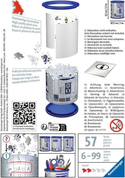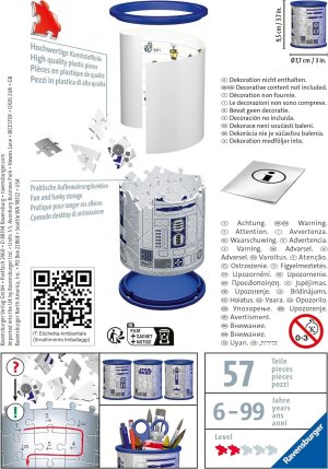 Tužky už se nebudou válet po stole a navíc bude krásný dárek vždycky na očích! Další z řady praktických předmětů ve formě 3D puzzle od výrobce RAVENSBURGER se stane skvělým dárkem pro každou příležitost. A nemusí sloužit pouze jako tužkovník, ale třeba jako stojánek na dekorativní kosmetiku a jiné věci. Speciální zakřivené dílky, které přesně zapadnou na své místo, vytvoří kouzelný stojánek nejen na psací potřeby, ale na cokoliv, co děti potřebují . Dílky jsou vyrobeny z pevného plastu a zaručí vynikající stabilitu bez nutnosti lepení. 3D puzzle RAVENSBURGER lze skládat podle motivu (obtížnější varianta) nebo podle praktického číslování na zadní straně dílků. Stojan má po sestavení výšku přibližně 9,5 cm o průměru 7,7 cm. Balení obsahuje: