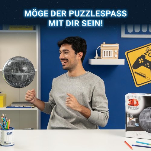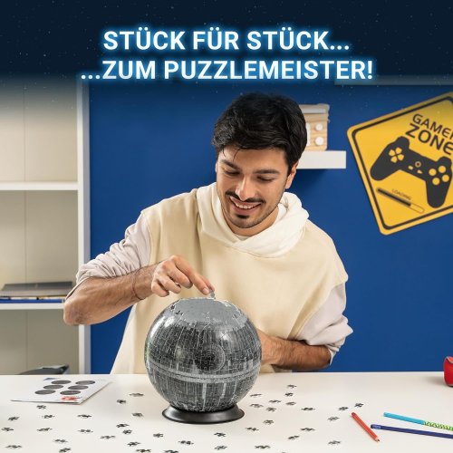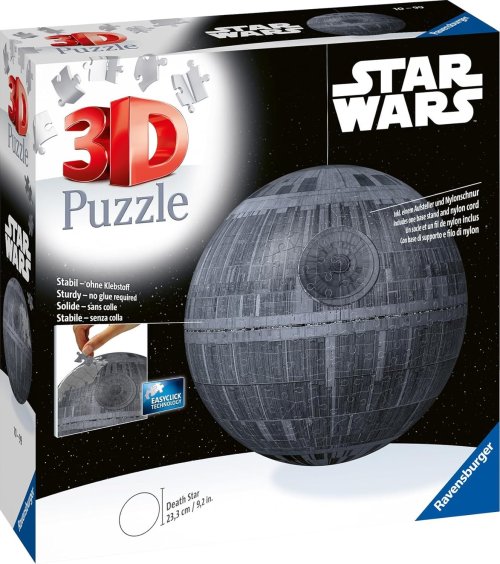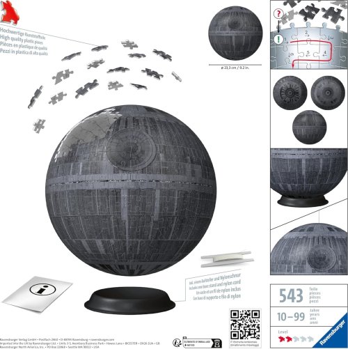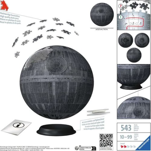 Dokonalá koule bez použití lepidla - to je 3D Puzzle Ball® od RAVENSBURGER . Každý z perfektně propracovaných 540 plastových dílků se podílí na vytvoření pevné, hladké koule. Speciální zahnuté dílky jistě zapadají do sebe a koule je po sestavení překvapivě stabilní. Puzzle Ball® obsahuje závěsné zařízení: slavná Hvězda smrti se tak může v budoucnu vznášet i u vás doma. Balení obsahuje: návod, stojánek a nylonový provázek. Puzzleball® má po sestavení průměr 23,3 cm. Rozměr složeného puzzle cca průměr 23,3 cm