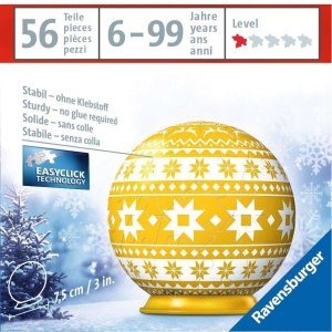 Dekorativní puzzleball jako vánoční baňka. Dokonalá koule bez použití lepidla - to je 3D Puzzle Ball® od RAVENSBURGER . Každý z perfektně propracovaných 56 plastových dílků se podílí na vytvoření pevné, hladké koule. Speciální zahnuté dílky do sebe pěkně zapadají a koule je po sestavení překvapivě stabilní. Baňka drží bez nutnosti lepení. Balení obsahuje 56 dílků, návod a podstavec. Puzzleball® má po sestavení průměr 7,5 cm. Doporučený věk: 6 - 99 let. Rozměr složeného puzzle cca 7,5 x 7,5 x 7,5 cm