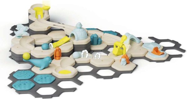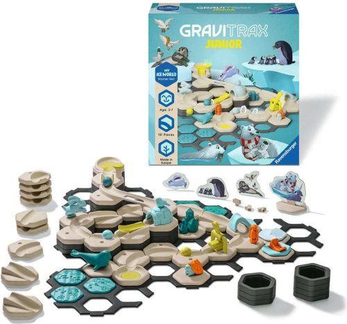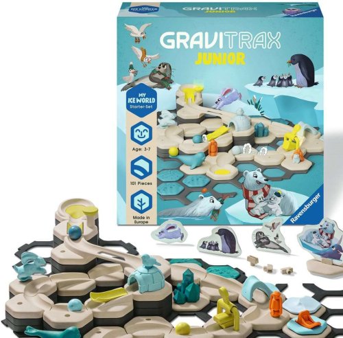 GraviTrax Junior je interaktivní systém kuličkové dráhy pro děti od 3 let. Ti nejmenší si staví své vlastní světy z kuličkových drah, které lze podle libosti zdobit a vytvářet tak jednotlivé tematické světy. Děti si tak při kreativním stavění užijí mnoho zábavy. Se startovní sadou GraviTrax Junior Ledový svět se mohou chlapci a dívky ve věku od 3 let okamžitě ponořit do dobrodružného světa plného ledu. Tato startovní sada obsahuje 101 dílků včetně akčních doplňků Houpačka a Kladivo, abyste mohli ihned začít stavět. Díky různým prvkům a figurkám zvířat a rostlin z dřevěného bioplastu zažijí děti od 3 let zblízka ledový svět, který si mohou při hře libovolně ozdobit.