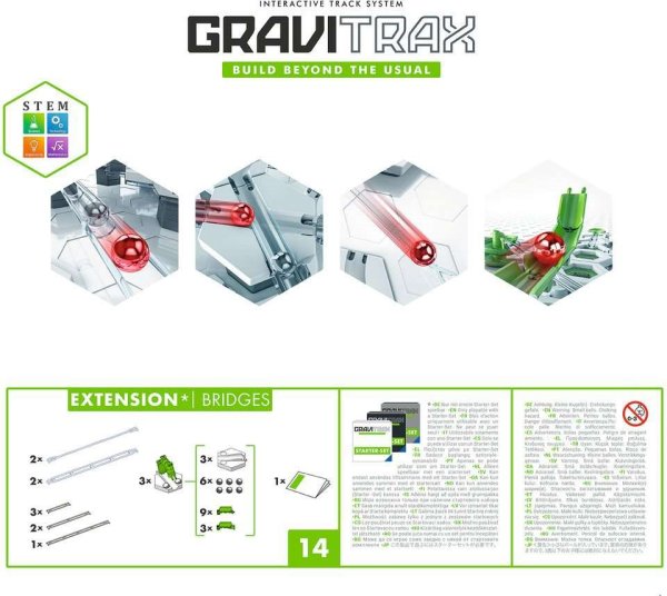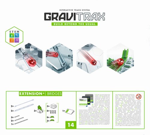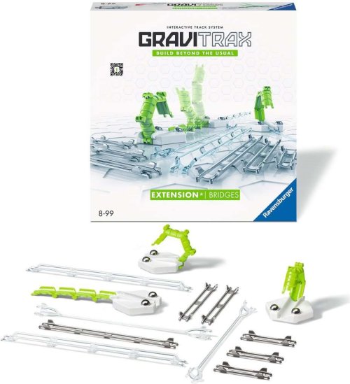 Tato sada doplní vaší stavebnici GraviTrax® o dva mosty a řadu drah. Mosty se před kuličkou samy rozbalí a umožní její přesun na vzdálenou část trati. Spojte jednotlivé úseky tratě ve velkolepé dráhy a objevte tak celou řadu nových konstrukčních možností.