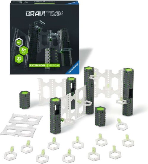 Překonávejte výškové rozdíly a nechte kuličky vyjet ze standardních tratí. Nové akční díly přináší jedinečné možnosti jak překonávat i několik poschodí najednou. Dynamické prvky umožňují vytvářet na vaší dráze nové prostory, nechat kuličku projet skr zdi a díky speciálním stěnám můžete stavět v různých patrech i balkony. Rozšiřující sada GraviTrax PRO Vertical je použitelná pouze se startovací sadou. Obsahuje: 1 návod, 8x sloup, 4x tunelové sloupy, 2x dlouhé stěny, 3x střední stěny, 16x balkon. Stavebnice RAVENSBURGER GraviTrax PRO pro náročnější stavitele s novými variabilními dílky posune vaši dráhu o další stupeň výš. Systém kuličkových drah s novými akčními díly umožňuje budovat vaši stavbu do výšky a napínavě tak překonávat různé výškové rozdíly a vést kuličky mezi jednotlivými patry nejen standardní cestou. Zkuste nechat projet kuličku skrze zeď a uvidíte, co se stane. Stavějte nové tratě plné jedinečných výzev. Kuličkodráha RAVENSBURGER GraviTrax PRO je plně kombinovatelná s "bílou" verzí Gravitrax, je možné ji libovolně rozšiřovat a vytvářet tak nové podoby složitých a unikátních cestiček s vytuněnými překážkami. Stavebnice zaručuje nikdy nekončící zábavu okořeněnou rozšiřováním vědomostí o vlastnostech gravitace.