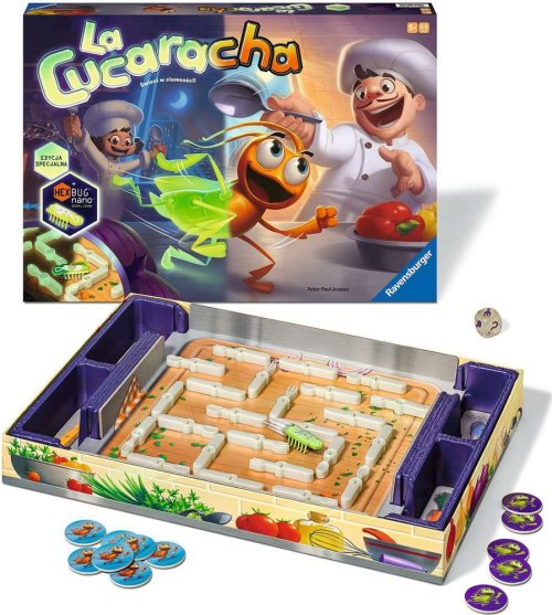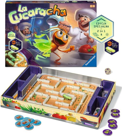 Speciální edice klasické hry! V kuchyni je šváb! Hraním hry s pelášejícím švábem se už 10 let baví miliony lidí. Brouk leze rychle, neztrácejte proto ani chvilku! Hoďte kostkou, otočte příborem a vlákejte ho do pasti. S touto limitovanou edicí si můžete zahrát dvě rozdílné hry. Kromě oblíbené základní hry zkuste mrštný hmyz vlákat do své pasti za tmy! Zhasněte světla – a hra začne světélkovat. Vysoce kvalitní fosforeskující barva a originální šváb HEXBUG® Nano® Světélkování ve tmě zaručují dlouhotrvající radost ze hry! Hra obsahuje: 1 šváb HEXBUG® Nano® Světélkování ve tmě (včetně baterie), 1 trojrozměrný herní plán, 24 otočných příborů, 4 pasti, 2 dvířka od pastí, 18 švábích žetonů, 1 hrací kostka, 1 pravidla hry.