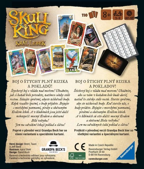 Štychový boj o vládu nad mořem. Uhodněte, jak si každé kolo povedete, zatímco sázky stále rostou. Sázejte správně, abyste získávali body. Když vsadíte špatně, o body přijdete. Bojujte s mořskými pannami, piráty a obávaným Králem lebek. A v hlubinách jsou ještě další nebezpečí: mocný Kraken a obávaná Bílá velryba. Jen na odvážné čekají poklad a sláva. Balení obsahuje 110 karet a pravidla hry