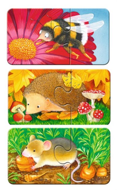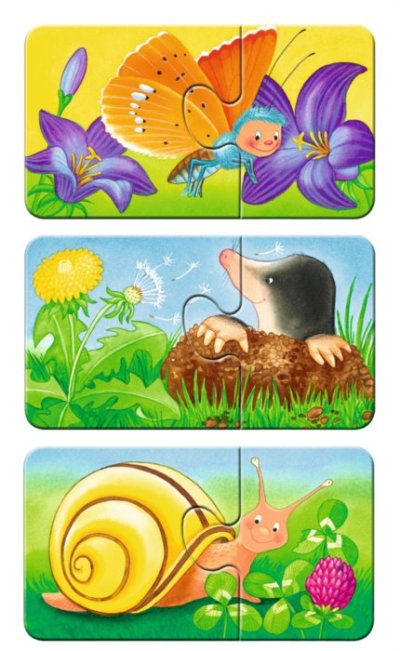 Dvoudílné puzzle s krásnými obrázky speciálně vytvořené pro nejmenší děti. Robustní pevné dílky jsou vyrobeny z extra silného kartonu a podporují u dětí rozvoj motoriky, soustředění a fantazii. Mezi devíti obrázky najdete oblíbené zvířátka, která můžete potkat na zahradě a v jejím okolí: motýl, ježek, beruška a další. Rozměr složeného puzzle cca 18 x 10 cm
