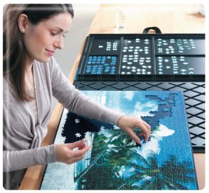 Praktické a bezpečné řešení jak uskladnit nebo přemístit rozeskládaný obrázek. Podložka na puzzle má neklouzavý podklad a celá pevná složka má uši na snadné přenášení. Nevyužité puzzlíky mohou být roztříděny podle barvy nebo tvaru do připravených přihrádek. Rozměr složeného puzzle cca 70 x 50 cm