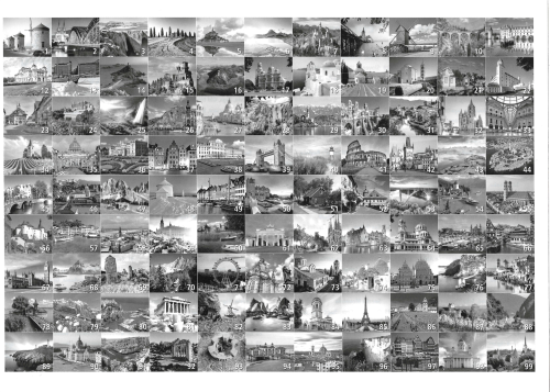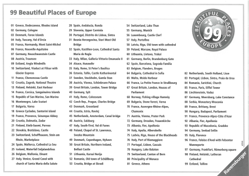 Součástí balení je i informativní leták s obrázky a názvy vyobrazených míst Evropy (v angličtině). Rozměr složeného puzzle cca 121 x 80 cm