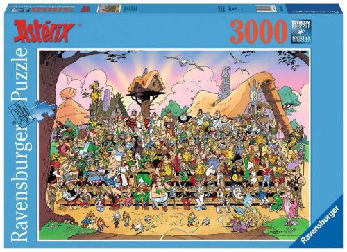 Asterix žije okolo roku 50 př. n. l. ve smyšlené vesničce v severozápadní Galii. Jeho nerozlučitelným přítelem je místní silák Obelix, který všechny převyšuje svou silou, kterou získal už jako malé dítě, když spadl do lektvaru se zázračným nápojem připraveným druidem Panoramixem. Tato vesnice je jediná, kterou si dosud nepodmanil Julius Caesar a jeho římské legie. Obyvatelé vesnice získávají nadlidskou sílu pitím kouzelného lektvaru, který jim vaří druid Panoramix (Anglicky: Getafix — jména jednotlivých postav si každá země většinou změní). Většina příběhů se točí okolo toho, že Římané chtějí galskou vesničku dobýt, za kterýmž účelem se snaží Galy různými způsoby přechytračit. Takové pokusy obvykle zmaří Asterix a jeho přítel Obelix. Rozměr složeného puzzle cca 121 x 80 cm