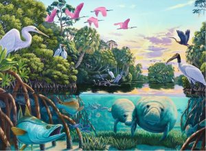 Věděli jste, že kapustňák floridský je poddruhem kapustňáka západoindického? Přezdívá se jim "mořské krávy", protože se živí mořskou trávou, a díky zákonu o ohrožených druzích se jejich počet zvýšil z 1 267 kusů před třiceti lety na dnešních přibližně 6 300 kusů! Naše uklidňující scéna zobrazuje matku kapustňáka a její mládě, jak si užívají průzračné vody v Everglades, zatímco volavka popelavá, čáp lesní a volavka modrá nacházejí nedaleko hojnost potravy. Rozměr složeného puzzle cca 49 x 36 cm