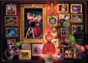 Puzzle ze speciální edice Villainous s nejznámějšími Disney anti-hrdiny, které rádi nenávidíme. Poskládejte si tisíci dílkové puzzle se svým oblíbeným záporákem. Červená srdcová královna - záporná postava s animovaného Disney pohádky Alena v říši divů z roku 1951. Rozměr složeného puzzle cca 70 x 50 cm