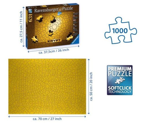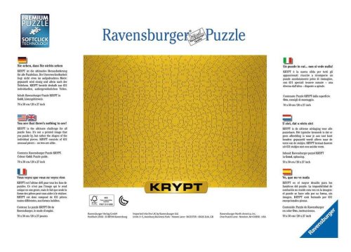 Skutečná výzva - puzzle skládané pouze podle tvarů dílků! Vidíte, že nic nevidíte :-) - žádný obrázek, jen jednobarevná plocha. KRYPT je největší výzvou pro všechny fanoušky puzzle. Není to tištěný obrázek, ale tvary jednotlivých kousků, podle kterých musíte skládat. KRYPT se skládá ze 631 kousků neobvyklých tvarů - žádné dva dílky nejsou stejné. Barva: zlatá Poznámka: Tvar dílků zlatého Kryptu odpovídá doplňkovému obrázku. Přední strana je pouze ilustrativní (je na něm zobrazený tvar dílků stříbrného Kryptu). Rozměr složeného puzzle cca 70 x 50 cm