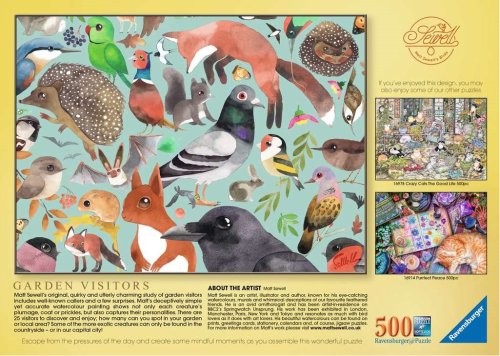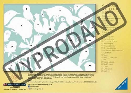 Součástí balení je také klíč v angličtině k identifikaci vyobrazených návštěvníků zahrad. Rozměr složeného puzzle cca 49 x 36 cm