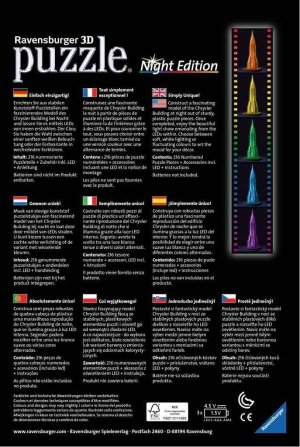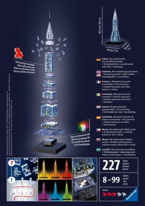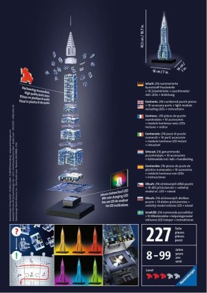 New York je město, které nikdy nespí! Nyní můžete mít kousek jeho záře i ve svém pokoji. Jedinečná barevně svítící stavba od mistra ve výrobě puzzle RAVENSBURGER, která se díky LED světlu ve tmě rozzáří, a navíc mění barvy - to je něco, co Vás doopravdy uchvátí. Noční Chrysler Building je skvělým dárkem i nevšedním kouskem v 3D rozměru. Speciální ohebné dílky, které díky technologii EASYCLICK přesně zapadnou na své místo, umožňují postavit fascinující model slavné budovy Chrysler Building. Dílky vyrobeny z pevného plastu zaručí vynikající stabilitu, a celá stavba drží bez nutnosti lepení. Díky originálním doplňkovým dílkům budou vaši stavbu všichni obdivovat. Balení obsahuje: 216 očíslovaných dílků puzzle, 10 dílů příslušenství, světelný modul včetně LED a návod. Baterie 3x AAA nejsou součástí výrobku. Ilustrační video Chrysler Building je mrakodrap v New Yorku, jednom z nejvýznamnějších měst Spojených států amerických. Nachází se na Manhattanu (Midtown Manhattan) a patří mezi jedny z nejznámějších symbolů města, hlavně díky svojí charakteristické špičce. Jako první mrakodrap na světě překročil výšku Eiffelovy věže (300 m) a pokořil magickou hranici 1000 stop (305 m), vyrostl až do výšky 318 m, dokončen byl roku 1930. Více na Wikipedii Rozměr složeného puzzle cca 18 x 18 x 47,5 cm