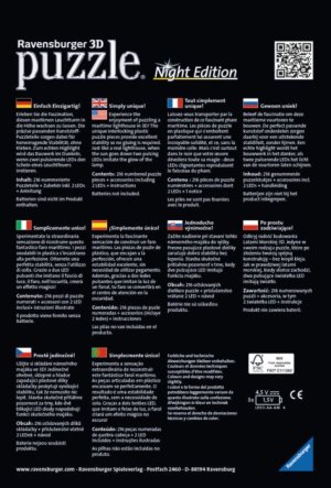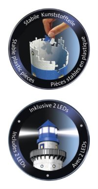 Maják s opravdovým světlem rozšiřuje řadu staveb v Noční edici. Dvě blikající LED diody dokonale simulují skutečný provoz majáku. Noční maják RAVENSBURGER zaručeně přitáhne pozornost a v noci posvítí všem opozdilcům na cestu do postele. Speciální zakřivené nebo ohebné dílky, které díky technologii EASYCLICK přesně zapadnou na své místo, umožňují postavit fascinující model majáku v příboji. Dílky vyrobeny z pevného plastu zaručí vynikající stabilitu, a celá stavba drží bez nutnosti lepení. Díky originálním doplňkovým dílkům budou vaši stavbu všichni obdivovat. Doporučený věk: 12 - 99 let Balení obsahuje puzzle, příslušenství včetně 2 LED a návod. Baterie 3x AAA nejsou součástí výrobku.