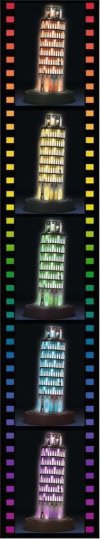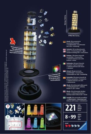 Originální zpracování italské Šikmé věže může osvětlovat i váš pokoj. Jedinečná barevně svítící stavba od mistra ve výrobě puzzle RAVENSBURGER, která se díky LED světlu ve tmě rozzáří, a navíc mění barvy - to je něco, co Vás doopravdy uchvátí. Svítící model je skvělým dárkem i nevšedním kouskem v 3D rozměru. Speciální ohebné dílky, které díky technologii EASYCLICK přesně zapadnou na své místo, umožňují postavit fascinující model slavné Šikmé věže v Pise. Dílky vyrobeny z pevného plastu zaručí vynikající stabilitu, a celá stavba drží bez nutnosti lepení. Díky originálním doplňkovým dílkům budou vaši stavbu všichni obdivovat. Balení obsahuje: 216 očíslovaných dílků puzzle 4 díly příslušenství, světelný modul včetně LED a návod. Baterie 3x AAA nejsou součástí výrobku. Ilustrační video Šikmá věž (Torre pendente) se nachází ve městě Pisa v Itálii. Stojí na Náměstí zázraků (Piazza dei Miracoli), zvaném též Katedrální náměstí (Piazza del Duomo). Zde je společně s kruhovým baptisteriem (křestní kaplí) a hřbitovem součástí církevního areálu kolem hlavní městské katedrály. Samotná šikmá věž kruhového půdorysu, postavená z bílého mramoru slouží jako zvonice. Je vysoká téměř 56 metrů. Více na Wikipedii Rozměr složeného puzzle cca 31,4 x 16,6 cm