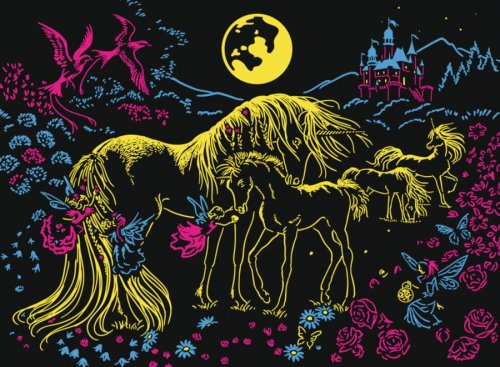 Neonové - fluorescenční puzzle s motivem jednorožců svítící barevně ve tmě ze série COLOR STAR LINE. Puzzle má speciální potisk, který po nasvícení ve tmě svítí. Vhodné pro děti od 6 let. Rozměr složeného puzzle cca 49 x 36 cm