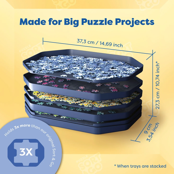 Sada šesti extra velkých, stohovatelných třídicích skořepin umožňuje snadno roztřídit až 3000 dílků puzzle podle tvaru a barvy a bezpečně je uložit. Otevřená hrana usnadňuje vysouvání dílků, zatímco protiskluzová spodní strana zajišťuje stabilitu při používání. Díky diagonální funkci stohování se skořepiny ukládají prostorově úsporně – ideální řešení pro každého milovníka puzzle, který má rád pořádek a přehled.