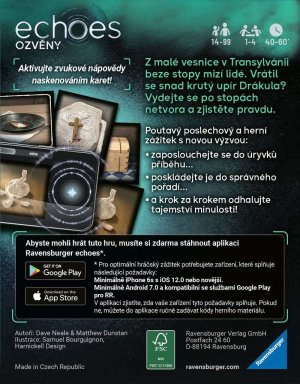 Z malé vesnice v Transylvánii beze stopy mizí lidé. Vrátil se snad krutý upír Drákula? Vydejte se po stopách netvora a zjistěte pravdu. Echoes, to jsou napínavé detektivní audiohry pro celou rodinu i partu přátel. Jak dobře dokážete naslouchat zvukům ve svém okolí? Ve hře echoes vyšetřujete záhady za použití svých speciálních schopností. Až budete zkoumat jednotlivé předměty, uslyšíte ozvěny z minulosti – tajemné zvuky a hlasy, které vám umožní odhalit tajnou historii předmětů a seřadit události do správného pořadí. Aktivujte zvukové nápovědy naskenováním karet. Poslouchejte zvuky a dialogy, které jsou propojené s herním materiálem. Najděte při poslechu všechny indicie, poskládejte je do správného pořadí a vyřešte záhadu. Ke hře je nutné stáhnout zdarma aplikaci Ravensburger echoes, která je kompletně namluvená v češtině – vypravěč Václav Neužil.
