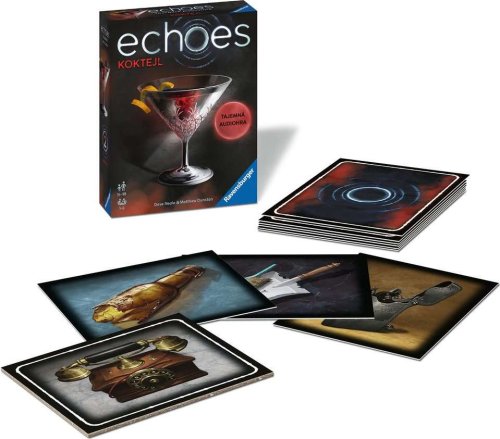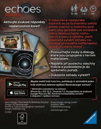 V zakouřené newyorské nálevně se za tlumeného světla schází zločinci z místního podsvětí, aby spřádali své zlověstné plány. Naslouchejte rozhovorům v baru a zjistěte, jestli dokážete vyřešit záhadu nechvalně proslulého mafiánského bosse „Krutého Steva“. Echoes, to jsou napínavé detektivní hry pro celou rodinu i partu přátel. Jak dobře dokážete naslouchat zvukům ve svém okolí? Ve hře echoes vyšetřujete záhady za použití svých speciálních schopností. Až budete zkoumat jednotlivé předměty, uslyšíte ozvěny z minulosti – tajemné zvuky a hlasy, které vám umožní odhalit tajnou historii předmětů a seřadit události do správného pořadí. Aktivujte zvukové nápovědy naskenováním karet. Poslouchejte zvuky a dialogy, které jsou propojené s herním materiálem. Najděte při poslechu všechny indicie, poskládejte je do správného pořadí a vyřešte záhadu. Ke hře je nutné stáhnout zdarma aplikaci Ravensburger echoes, která je kompletně namluvená v češtině – vypravěč Václav Neužil.