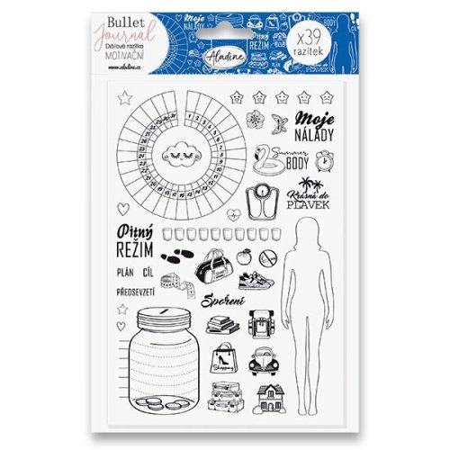 Sada nápaditých diářových razítek Stampo Bullet obsahuje 39 motivačních symbolů, které oživí váš diář nebo deník. Motivační razítka vám pomůžou při dodržování pitného režimu, zdravého stravování či plánování pohybových aktivit. Jednotlivé motivy se dají vybarvovat a využít i na přáníčka nebo originální zabalení dárku. Celkový rozměr plata s razítky je 19,5 x 13,5 cm.