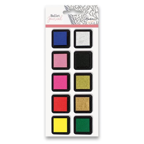 Razítkovací inkoustové polštářky k diářovým razítkům Aladine. Sada obsahuje 10 ks barevných rychleschnoucích inkoustových polštářků v základních barvách. Metalické odstíny (zlatá, stříbrná) schnou 30 minut. Upozornění: inkousty nejsou vhodné na křídové povrchy.