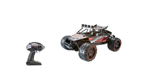 RC auto Monster truck v měřítku 1:10 představuje robustní a výkonný model určený pro náročné jízdy na různých typech povrchů. Tento monster truck je vybaven masivními pneumatikami s výrazným vzorkem, které zajišťují dobrou trakci a stabilitu i na nerovném terénu. Karoserie má sportovní design s výraznými nápisy "RAPTOR" a "PANITER" a je dostupná ve dvou barevných variantách – červené a modré detaily na černém podkladu, což dodává autu dynamický a agresivní vzhled. Na střeše jsou umístěny čtyři světla, která přidávají na autentičnosti a podtrhují off-road charakter vozidla.
