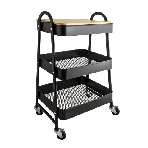 Kvalitní police na kolečkách vyrobená z černě lakované oceli. Horní MDF deska imitující přírodní masivní dřevo, která zároveň slouží jako kryt mělké police na drobnosti. Navíc má dva koše s perforovaným prolamovaným dnem. Kolečka zajišťují mobilitu, ale jsou také vybavena zámky, aby se regál nehýbal. Regál vyžaduje vlastní montáž. Rozměry 45.5 x 30.5 x 78.5 cm, hmotnost 5.59 kg. EAN 5905668551749