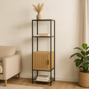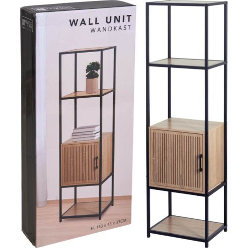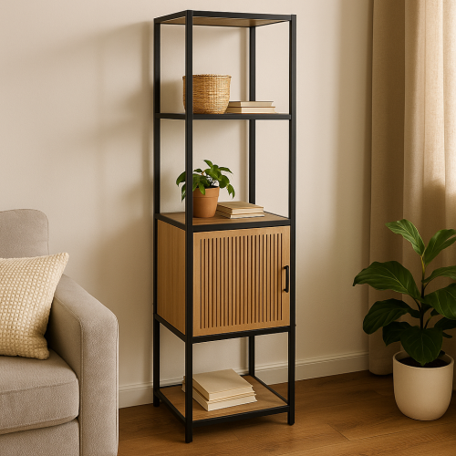 Stylová a praktická skříňka s černým kovovým rámem, vybavená policemi a dvířky z MDF dýhy z přírodního dřeva. Nabízí 5 úložných vrstev pro organizaci věcí a doplňků.