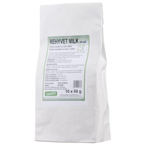 REHYVET MILK je schválený veterinární přípravek, je účinným řešením problémů dehydratace a acidózy vzniklé při průjmových onemocnění u telat. Díky použitému citronanu lze kombinovat léčbu spolu s napájením mlékem. Tím se do těla telete dopraví dostatek energie a bílkovin, které i poškozené střevo je schopno alespoň částečně vstřebat a trávit. Po aplikaci připraveného roztoku dochází k rychlému vyrovnání ztráty vody, sodíkových a draselných iontů a energie. Citronan sodný slouží v těle jako zdroj bikarbonátu a kompenzuje tak metabolickou acidózu vznikající při průjmových onemocněních. Glukóza jako zdroj pohotové energie je nezbytná i pro resorpci elektrolytů a vody z tenkého střeva. Probiotika, obsažená v přípravku, zlepšují rovnováhu střevní mikroflóry, podporují její růst. Tím dochází k potlačování škodlivých mikroorganismů a také ke zvýšení odolnosti střevní mikroflóry. Chlorid draselný a sodný nahrazují ztrátu sodíkových a draselných elektrolytů. Dehydratace organizmu (lehký a střední stupeň), průjmová onemocnění telat.