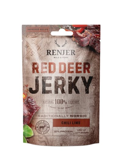RENJER - to je pravá chuť divočiny z hlubokých lesů severní Evropy! Ochutnejte fantastické jelení, losí a sobí sušené maso od Renjer. Každý kousek je ručně řezaný a delikátně sušený, aby si zachoval svou jedinečnou chuť. Jde o sušené maso z divoké lesní zvěře, které má přírodní stravu. Důsledkem toho je maso opravdu bohaté na živiny. Vyznačuje se vysokým obsahem bílkovin s malým množstvím tuku a nulovým podílem sacharidů. Důkladný výběr syrového masa a šetrná výroba je zárukou nejvyšší kvality.