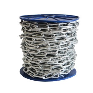 délka: 30 m síla řetězu: 4,90 mm rozměr článku: 36 mm x 10,2 mm maximální zatížení: 408 kg Dlouhočlánkový řetěz je vysoce odolný a využitelný převážně v exteriéru.